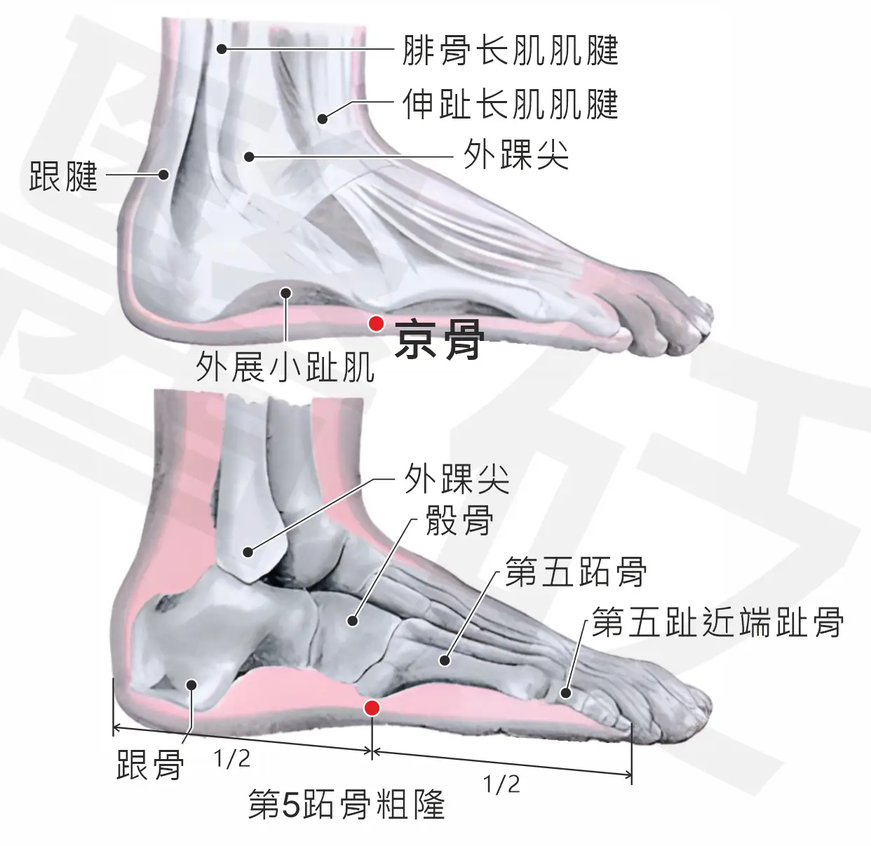 京,高大。京骨,指突出的第五跖骨粗隆部,穴当其下方,故名。