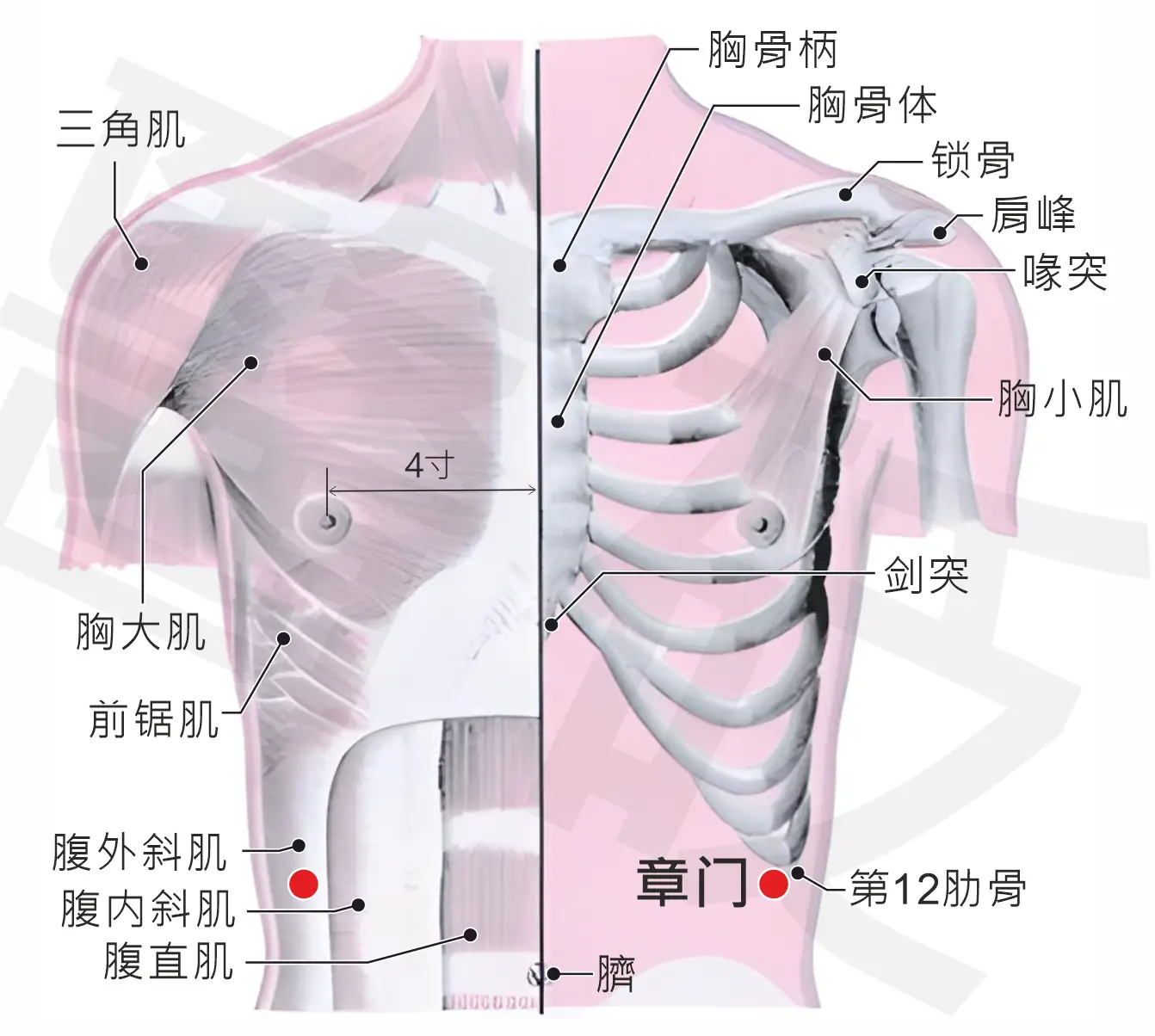 • 肌肉:腹外斜肌、腹内斜肌、腹横肌。深部右侧章门为肝右叶前缘,左侧章门为脾脏下缘。