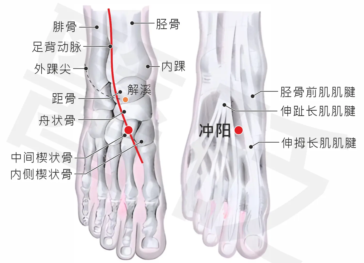 穴当足背动脉搏动(趺阳脉)处,血气旺盛,因称“冲”;又为足背高处,因称“阳”。