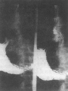 X线检查:内腔镜检查为诊断食管裂孔疝的主要方法。钡餐检查最为常用,但需用手法帮助才能显示出疝。令患者左侧卧位,头低,当胃内充满钡剂后,以手压迫腹部,令患者用力摒气,此时可出现裂孔疝指征:膈下食管段(腹段)变短增宽或消失,贲门部呈现幕状向上牵引,膈上可见胃囊(图1、2),膈上出现食管胃狭窄环(Schatzki环形狭窄),此环相当于鳞状上皮和柱状上皮交界处(图3)。有食管狭窄时,粘膜变形,管腔缩窄。短食管时则膈上有粗大的胃粘膜,食管胃交界点因瘢痕收缩可上升至第9胸椎水平。作钡餐检查时,用以刺激返流的手法中,以Muller手法比较有效(呼气后关闭声门,再用力吸气以增加胸内负压,促使胃内钡剂反入食管);有人用“饮水”方法;让病人喝水入胃,与钡剂相混合,然后挤压腹部。在有条件的医院,应将上胃造影做成录像带,以便反复检查。多数人认为有裂孔疝时不一定有X线上的返流征象;而有返流征象时不一定有裂孔疝。有幕状牵引者是否诊断为裂孔疝,意见尚不一致。正常食管壶腹不应误认为裂孔疝,弥漫性食管痉挛可以发生裂孔疝和胃液返流征象。硬皮病和贲门失弛缓症时食管缺乏蠕动功能,也要和裂孔疝相区别。如发现食管有机械性缩窄,应作多方面观察。以区别新生物、溃疡性良性缩窄或食管动力性疾病,一般认为,放射科医生关于缩窄原因的报告只能作为诊断时的参考,对每位病人必须有组织学诊断。
