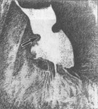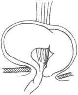 较大的滑动型裂孔疝在病人休息状态下,即可在钡餐检查时发现,有一个>3cm的胃囊突入胸腔,常伴有没程度的胃食管返流每时征。手术中可发现这些病例的膈食管膜,其伸入食管壁的位置较正常人靠近胃食管接合部,这样低位的伸入,是否为先天性或后天性因素造成尚不清楚。此疝较少见,约占全部裂孔疝的2%,但由于腹内脏器疝入胸腔,故有重要的临床意义。此疝的膈食管有缺损,通常在裂孔的左前方,偶尔在右后面。由于此缺损的存在,使腹膜能通过此缺损成为真正的疝囊,相邻的胃也通过此筋膜的缺损疝入胸腔(图4)。由于膈食管膜不能长期限制上移的胃,而且在部分时间胸腔压力低于腹腔压力,此缺损必然进行性扩大。在后期,全胃均可疝入胸腔,而贲门仍被膈食管膜部分固定在原处,幽门已向其靠近,胃可以发生旋转、扭转、梗阻和缩窄,胸胃扩张破裂,如延误诊治,任何一种并发症均可导致死亡(图5)。正由于上述原因,即使尚无明显症状的食管旁疝,也应考虑及早手术。