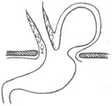 此操作应特别轻巧,返流性食管炎造成食管下段后壁及其周围组织炎症水肿,组织脆弱,粘连严重,分离时易受损伤,而其前壁病变较轻,不易分破。为避免损伤炎症较轻的后壁,可用右手食指触及腹主动脉的搏动及胸椎前面,借凭胃管的走向,正确判断食管后壁与周围组织的关系。如无严重食管炎,迷走神经后支也可分离开,以免以后被包裹在内。将胃底后壁由左向右方向,在下段食管后拉过,到达右侧时,此后壁只包裹住食管而非近段胃。第一针缝线穿过胃底前壁,食管下段的肌层和粘膜下层及胃底后壁。将此缝线拉紧,如在胃底包裹与食管(内有大号胃管)之间可通一食指,说明松紧度合适,则可结气缝线。然后在其下安置另一根,在其下安置另二根缝线,但均不穿过食管壁,再检查此包裹的松紧度。有些外科医生建议将全部胃底缝线均穿过食管壁防止食管下段在此胃底包裹中上下滑动。为稳定此胃底包裹,再用2~3根缝线,将其下缝固于胃前壁。关腹后,在拔除气管插管前,拔除大号胃管,换以鼻管供术后减压。此手术不包括缝缩裂也的操作。