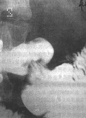 圖1 胃粘膜脫垂症的X線象顯示十二指腸球底部的「蕈狀」變形
