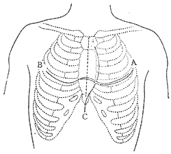 2.左胸前外側切口 經第五肋間隙進胸,右側需切斷結紮胸廓內動脈并橫斷胸骨,左側達腋中線。此種切口的優點是單側開胸,對呼吸功能的影響小,病人狀態較差者可以採用。左心顯露好。左室及上、下腔靜脈顯露較差。