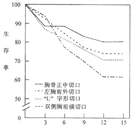 2.晚期生存情況 Kirklin JW報告手術後5年及15年生存率分別為84%與59%。McCaughan BC報告5年、15年及30年生存率分別為84%、71%與52%。影響晚期生存的主要因素仍是術前心功能狀態,而與手術入路無明顯關係(圖3)。