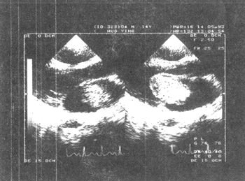 ⑶心室粘液瘤:收缩期异常回声团突入左室流出道或右室流出道,舒张期在左室腔内或在右室腔内,可见异常回声团在心室腔内随血流方向有规律的摆动。