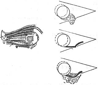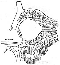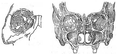眶底骨折薄弱,主要由上頜骨眶突即上頜竇上壁構成,外側為顫骨眶突。眶底呈一向後上延伸的傾斜平面,其後部為薄弱區,有眶下管及眶下裂通過。該區和篩骨紙板相連,構成眶底的內下壁,其薄如紙(圖2)。當面中部受外力撞擊發生骨折時,眶底衝擊,使眶內壓劇增,可造成眶底骨折(fracture of orbital floor),這種骨折又稱暴裂骨折(blowout fracture),由於眶底下方為上頜竇,眶底骨折常使眶內容疝入上凳竇內(圖3)。