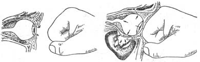 2.眼球陷沒  是眶底骨折的重要體徵。造成眼陷沒的主要原因是:①因眶底骨折,眶內容連同眼球向下移位或疝入上頜竇腔內;②眶底骨折片移位,使眶腔增大,眶內脂肪支持眼球的量不足(圖4)所致。