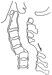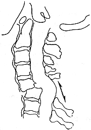 這種類型的頸椎骨折脫位有兩種變化。一種合併椎弓骨折者,椎體向前移位,而椎弓、椎板和棘突仍留在下位脊髓水平并呈正常序列(圖1)。另一種椎弓骨折,其椎弓等結構與上位脊柱後結構呈正常連結序列,脫位的兩個脊椎椎弓、椎板和棘突分別向上下方分離張開(圖2),而椎弓骨折者後結構張開在脫位椎體上方的椎弓間。骨折脫位節段的脊髓并不與脫位脊椎同步成角,而是向後移動離開椎管前壁的骨性突起。作者對此類患者作椎管造影,並能清晰顯示出移位脊髓的外觀。Blothman也觀察到這種脫位,儘管引起相當多數的脊髓損傷,但也有部分此類損傷者神經組織并未遭受到損害,并認為可能同損傷節段的後結構破壞并向椎管外側分離有關。