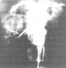 ⑵數字減影血管造影術(digital subtraction angiography,DSA):1981年Buonocore、Hillman等報導DSA應用於腎血管造影,具有方法簡便、影像清楚等優點。DSA在70年代以前業已應用,乃是從直接動脈插管進行血管造影術減去與未注射造影劑前的平片影像,可消除與血管影像無關的其他影像(如骨骼、軟組織陰影),使血管像顯影清晰,稱為減影血管造影。70年代後期,美國威斯康辛大學設計出數字式視頻影像處理器,並在動物及人體進行測驗,至1980年數字減影血管造影技術才成功地應用於臨床。1981年底報告700例,其中71%為頸動脈,12%為腎動脈,9%為顱內動脈,8%為胸部及周圍血管。
