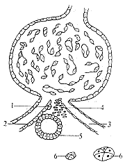 ⒈近球細胞;⒉入球動脈⒊出球動脈⒋Goormaghtigh氏細胞;⒌緻密度;⒍Becher細胞群