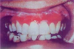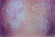 (5)糜爛:糜爛型常見,範圍相當廣泛,幾乎可遍及整個口腔粘膜。雖然,在某些區域尚可隱約顯示白紋樣損害,由於沒有典型表現,故不能為臨床提供診斷依據。附著齦的糜爛常可見殘留的疱壁,狀如「上皮剝脫」,這種具有剝脫性的臨床表現可見於多種炎症性疾病(天疱瘡、類天疱瘡等),所以舊稱「剝脫性齦炎」,現在已不作為獨立存在的疾病。本型對於抗生素與免疫抑制劑治療常具有對抗性,必須進行全面的系統性檢查,以免貽誤診斷與治療。(彩圖3)