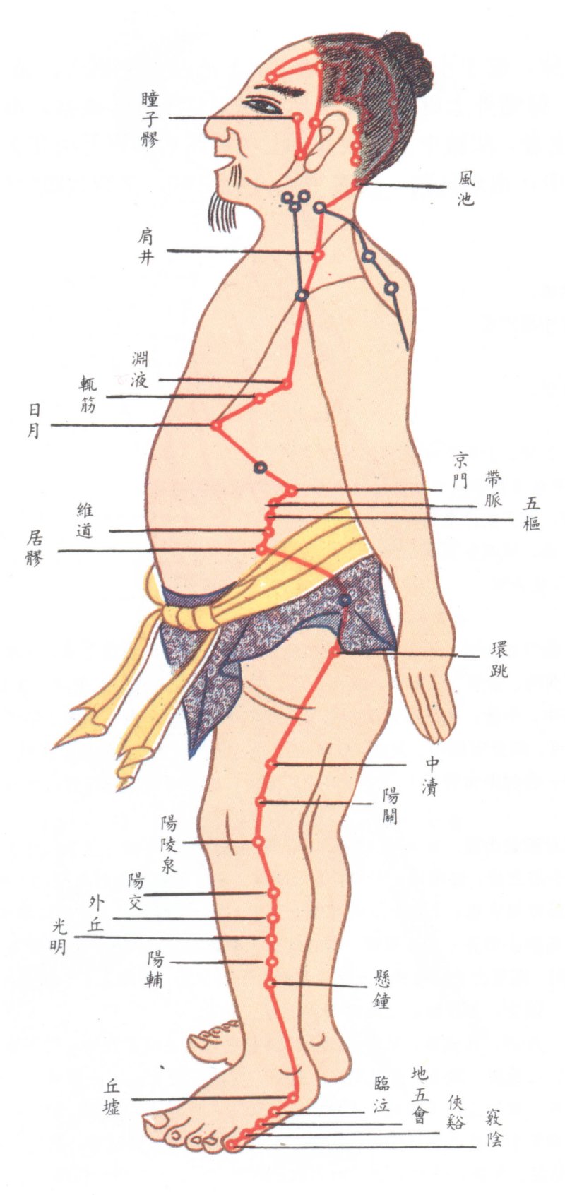 十二經脈之一。它的循行路線是:在體內,屬膽、絡肝。在體表,由眼部經側頭部、耳部、頰部、後頭部、肩部、側胸腹部、下肢外側,止于第四趾端。本經有病時,主要有瘧疾、惡寒、有汗、頭痛、頷痛、目痛、口苦、鎖骨部及腋窩部腫痛、胸及側胸部痛使身體轉側困難、甲狀腺腫大、淋巴結桔核等病症,以及在本經循行部位的局部症狀。