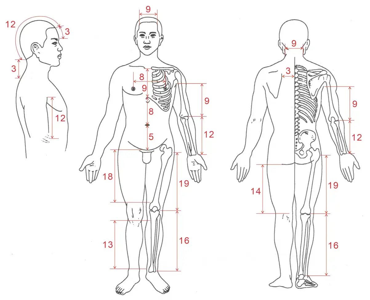 《靈樞‧骨度》所測量的人的標準高度為7尺5寸,橫度(兩手平舉)也是7尺5寸,並按比例規定了人體各部的分寸(見附表)。臨床上為了取穴應用的方便,個別部位的折寸與《靈樞》略有出入。如前臂從肘至腕折作12寸,原為12.5寸。下腹部從臍至恥骨聯合上緣《靈樞》原定6寸半,現一般多作5寸。從實際長度來看,這裡的1寸實際長度比上腹部的1寸為長。所以也有人將它折作6寸。