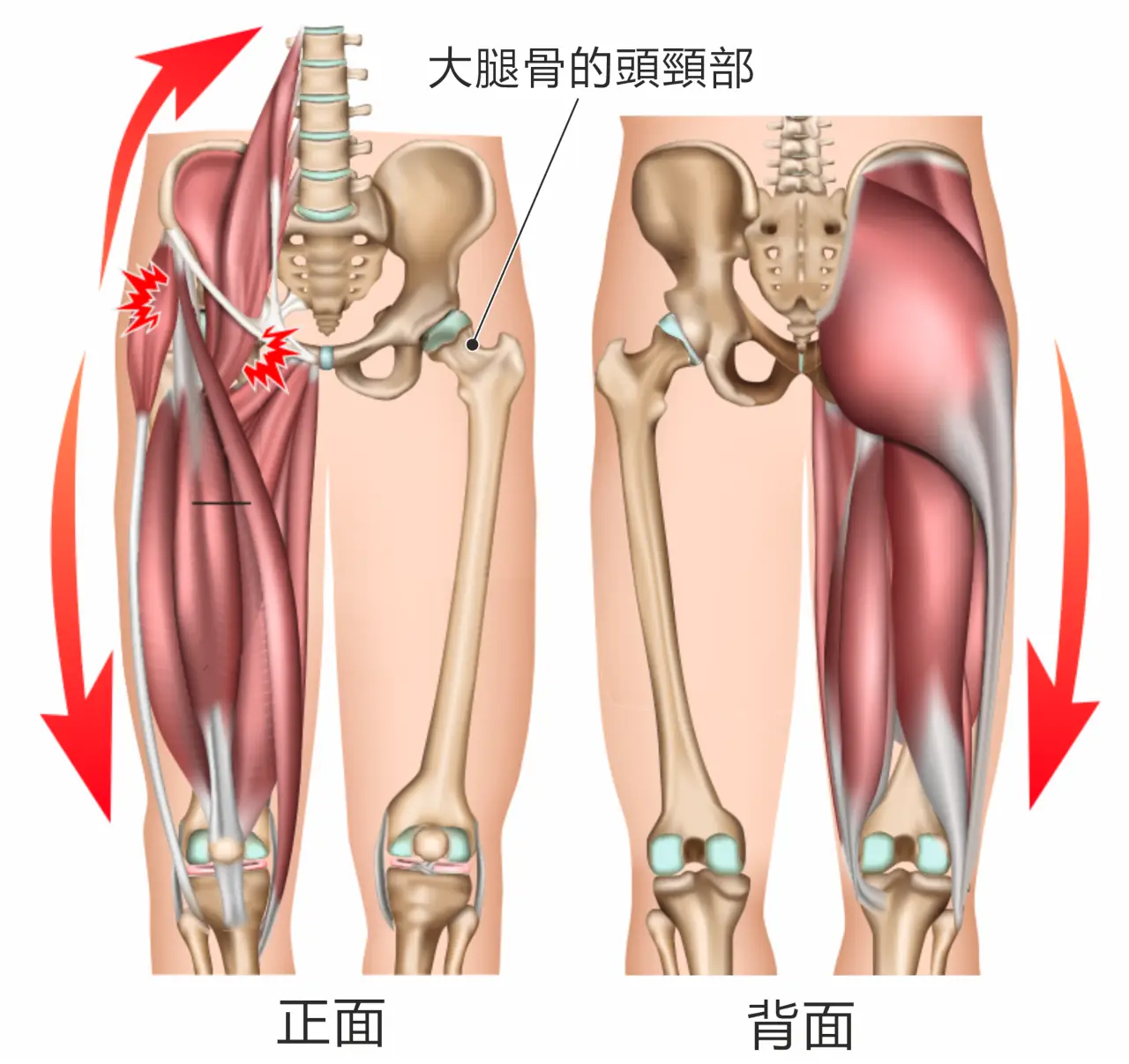 大腿的屈、伸就靠髖關節上下的肌肉群的收縮所牽動,當勞動、運動過後,腰、腿的肌肉即處於緊繃狀態,由於許多腰部肌肉會附在大腿骨上,許多大腿的肌肉也會附在腰脊骨上,它們前後上下包夾著髖關節(圖1),當這些肌肉一緊繃,髖關節的壓力也會加大,若未適時放鬆這些肌肉,髖關節即持續處於較大壓力之下,更加速髖關節的磨損。